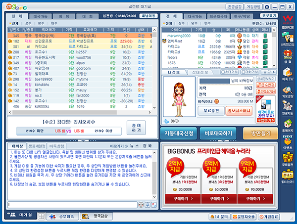 - 해당 대국 방의 대국 상태, 현재수순, 대국 종류, 판돈 등의 정보를 볼 수 있습니다.