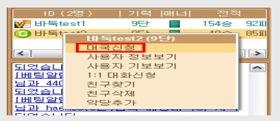 유저 목록에 있는 회원에게 마우스 우 클릭을 눌러 메뉴를 띄우고 대국신청을 할 수 있습니다. (대기실, 대국실 동일)