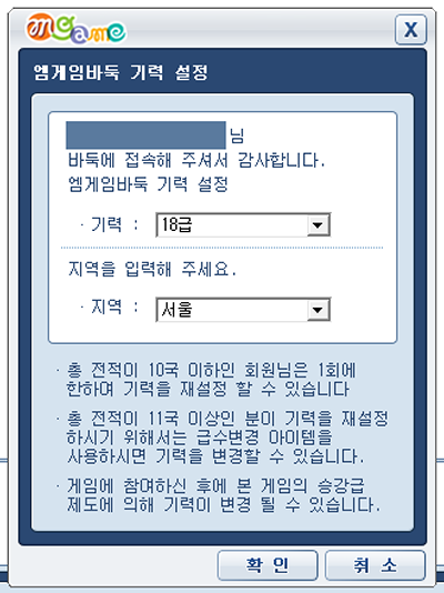 처음 접속하시면 본인의 기력과 지역을 선택하실 수 있습니다.