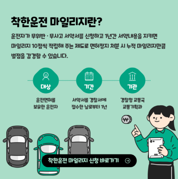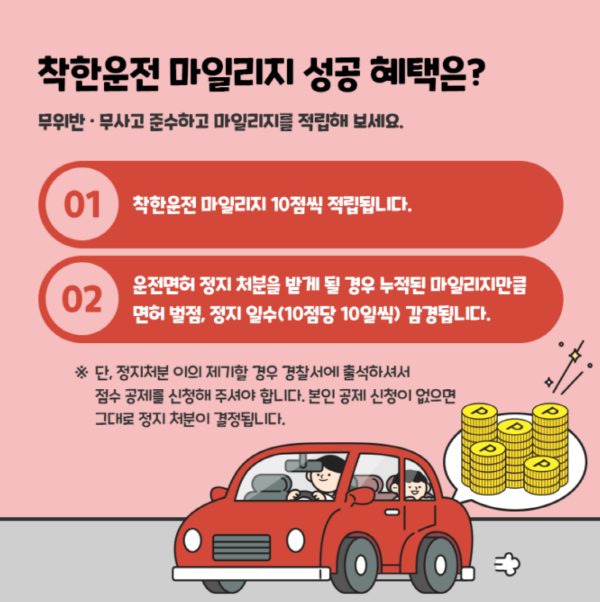 이 두 가지 조건을 1년간 지킬 경우, 운전자는 10점의 착한운전 마일리지를 적립할 수 있습니다.