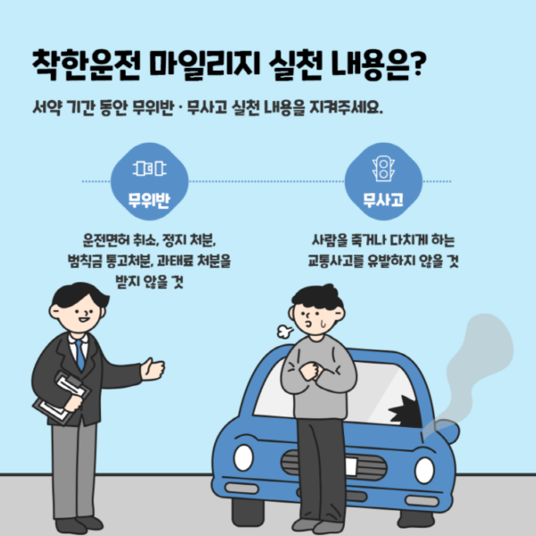 운전자가 무위반·무사고 준수 서약을 하고 1년간 이를 지키면 10점의 마일리지를 적립받게 됩니다.