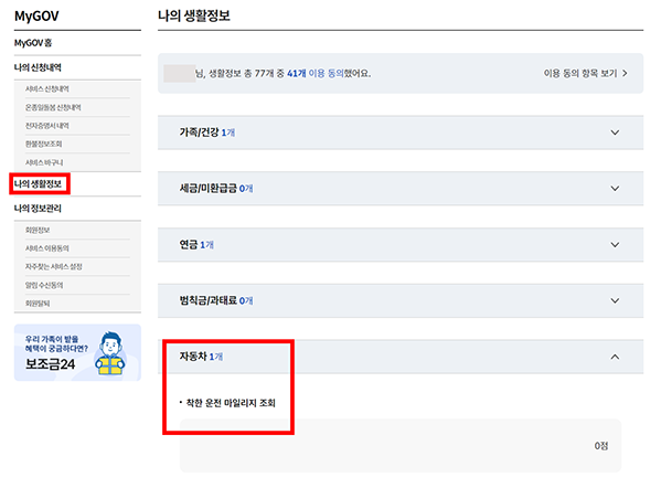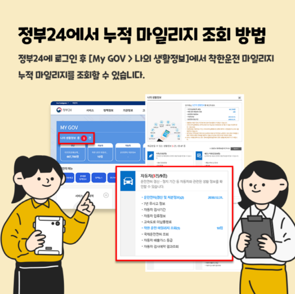 MYy GOV > 나의 생활정보 에서 착한운전 마일리지 누적 마일리지를 조회할 수 있습니다.