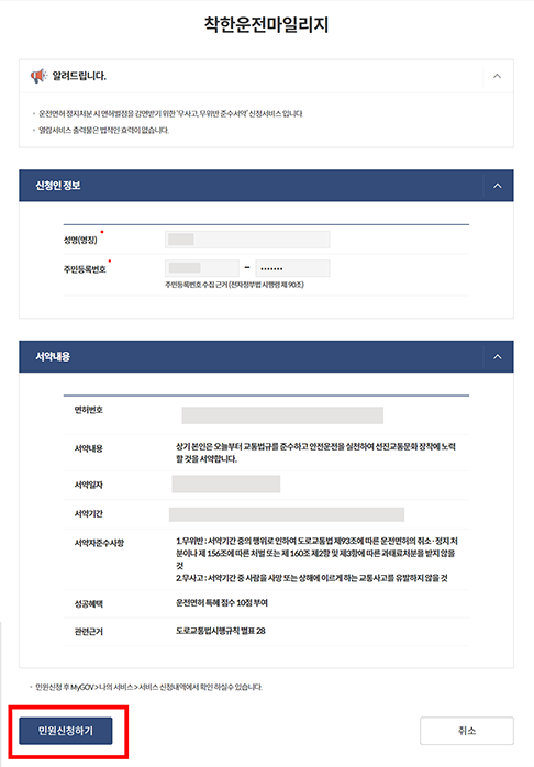 - 운전면허증 또는 신분증을 지참하고 서약서를 작성합니다.