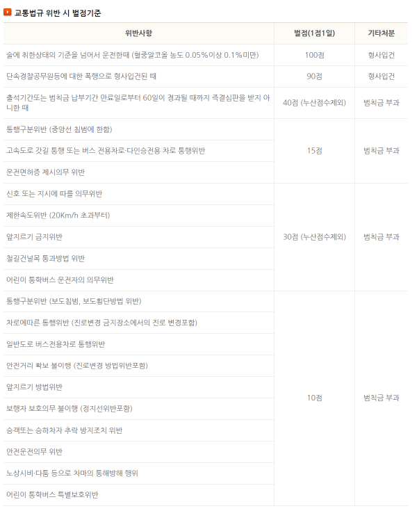 | 100점 | - 속도위반 100km/h 초과 - 음주 운전 (혈중알코올농도 0.03~0.08%) - 보복 운전으로 형사 입건 시 |