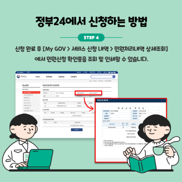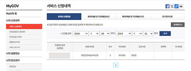 신청한 내역을 확인하려면, 정부24 홈페이지에 접속하여 'My GOV' 메뉴에서 '서비스 신청 내역' → '민원처리내역 상세조회'을 통해 확인할 수 있습니다.